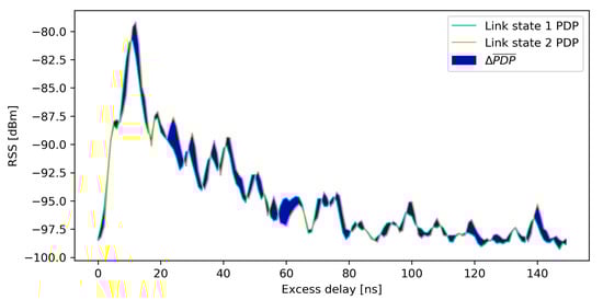 Two PDPs for different states of the same radio link. Link state 1 PDP presents the average PDP for one radio environment state. Link state 2 PDP presents the average PDP for another state of radio environment, where a person changed the location within the same environment. The difference between two states is presented with absolute PDP difference marked in blue.