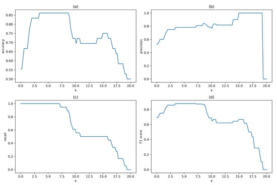 We investigated the range of most suitable values for k on one of the validation datasets from the office environment with manually annotated motion events. We evaluated the classification performance in terms of accuracy, precision, recall, and F1 score. Results for these performance metrics versus increasing threshold as the number k of MAD values from 0 to 20 in step by 0.2 are depicted in Figure 6, indicating that best performance for this batch was obtained for k between 3 and 7. Results for are summarised in Table 1 and show that the samples were accurately classified in 86% of cases, with 78% precision for activity samples and 100% for static samples. Recall statistics present a positive bias towards detecting activity samples with 100% recall and less reliable detection of static samples with 72% recall.