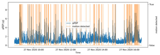 The resulting values are the numerical integrals of absolute differences between two moving averages and describe the difference in average energy received per one UWB symbol in zeptojoules (). Figure 4 shows time series of calculated PDP differences () on measurements of one link in an office environment in a thirty-hour period. The flat part of the presented signal between 5 October 2020 at 21:00 and 6 October 2020 at 9:00 present signal for an empty environment, preceded and succeeded by a signal denoting significant movement events.