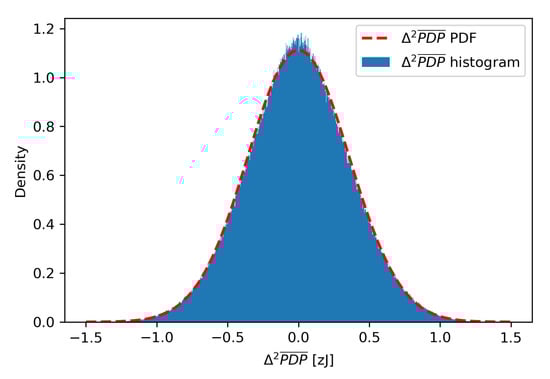 An estimated value for can be obtained by subtracting consecutive values, which is described by Equation (6). Figure 8 presents a histogram of values for multi-day channel sounding measurements in an environment without any significant movement. The histogram resembles normal distribution, and normality of probability distribution was confirmed with the D’Agostino’s test yielding p = 0.891. The mean value of the and its standard deviation are equal to and , respectively.