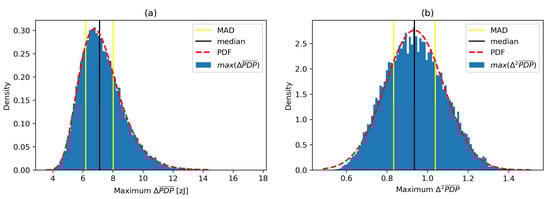 To estimate the statistics of maximum windowed values and maximum windowed values, we applied a sliding window with the window length on the selected N samples from the environment without motion. This gives maximum and estimates. Histograms, fitted probability density functions and some statistical values for online maximum and online maximum values in a sliding window are depicted in Figure 9.