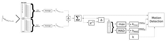 The difference between the new and the previous value (i.e., ) is calculated and inserted in the fixed length delta FIFO buffer holding the most recent 100 values. For each PDP update, the maximum value, , and MAD, , are calculated for the values in delta FIFO buffer and multiplied by the corresponding scaling factors and . Finally, the current value is used, together with the scaled and values, as an input to the motion detection algorithm.