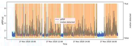 Figure 12 presents the results of OAMD motion detection on the same data that were used in Figure 7 for the batch process motion detection. Figure 7 and Figure 12 indicate that the adaptive detection threshold in OAMD algorithm helps detecting the motion considerably more reliably also in highly dynamic conditions, whereas batch processing motion detection becomes rather insensitive in an environment characterised by significant motion. Flat sections of the graph are detected as motionless environment, and parts of graph with higher values are recognized as motion presence. The motion detection graph marks the values with orange at the moments where motion was detected. The actual value of the motion detected is boolean True or 1 and boolean False or 0 for the moments, where motion was not detected. A quantitative evaluation of the OAMD performance is discussed in the following section.