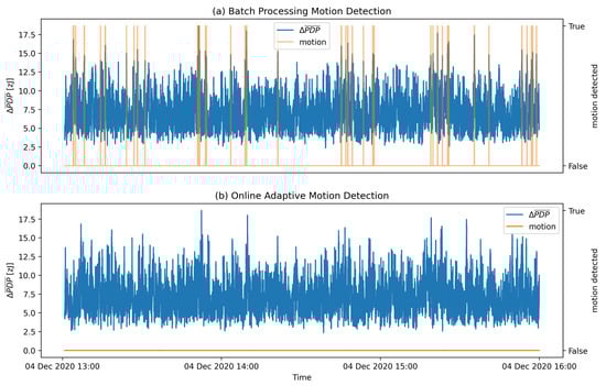 In particular, we first used the batch processing approach to motion detection where we calculated median and MAD values for a batch of past N PDP differences and determined a suitable fixed motion detection threshold expressed as the number of k MAD values away from the median