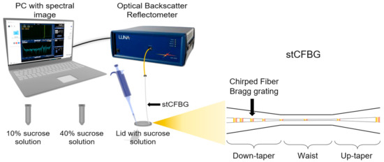 Response to outer refractive index changes was measured using various concentrations of sucrose solution (Figure 1, 10% sucrose was used as a starting concentration to check the sensitivity of the gold-coated stCFBG. The concentration of the solution was increased as 40% sucrose was added gradually onto the lid, with the stCFBG inside changing the refractive index from 1.34974 to up to 1.35845.