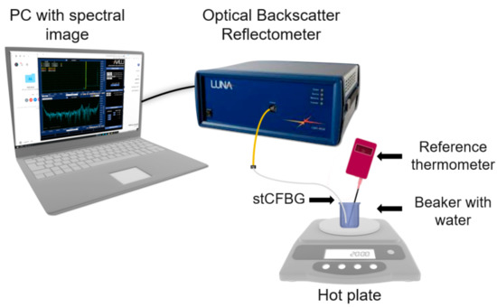 Temperature calibration of a gold-coated stCFBG submerged in a beaker with water maintaining a constant refractive index was performed on a hot plate (C-Mag HS4/IKA magnetic stirrer, IKA, Stausen, Germany), as shown in Figure 2, and a thermometer (ETS D-5/IKA electronic contact thermometer, IKA, Stausen, Germany) measuring the reference temperature was placed inside the same beaker. Spectral changes of gold-coated stCFBG were recorded every 5 °C as the temperature increased from 30 °C to 80 °C.