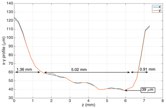 In this section, we report the geometrical and spectral characteristics of the stCFBG presented in the previous section. Figure 3 shows the profilometry of the taper, as measured through the CO2 laser splicer; in this figure, we present the diameter along the horizontal axis x and vertical axis y (referred to the splicer, x along the splicer plane, y vertically aligned), as a function of the position along the fiber direction z.