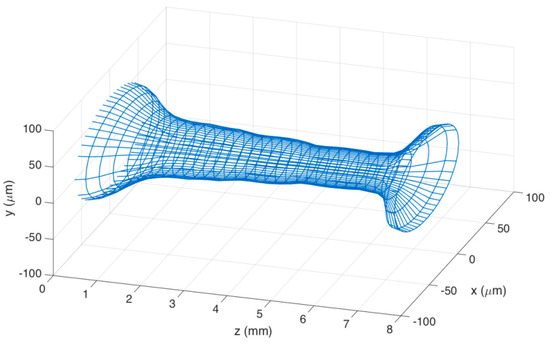 Figure 4 shows the mesh of the stCFBG in the tapered region in a tri-dimensional chart, which allows visualization of the shape of the tapered region and the profile of the taper moving along the axis z. The mesh has been generated by projecting, for each fiber section along z, the elliptical profile on each xy plane having the diameters measured during the profilometry as x/y main axes.
