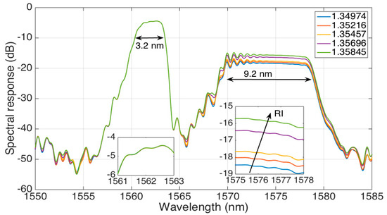 The leftmost part of the spectrum (3.2-nm wide), which corresponds to the shorter wavelengths, can be defined as a pre-taper region as it corresponds to the CFBG part lying before the tapered fiber section. Hence, the spectral characteristics of the CFBG are substantially maintained in this region, which shows a reflectivity level of −5 dB and a flat spectrum from 1561 nm to 1564 nm. As the light is perfectly confined in this section, the spectral characteristics are RI-independent, as shown in the left inset of Figure 5.