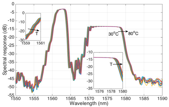 This trend is observed in Figure 6, where the spectrum of the stCFBG in water is shown for temperature values rising from 30 °C to 80 °C in steps of 5 °C. We observe that the temperature change results in a much different behavior than the RI change. The whole spectral fingerprint shifts towards the longer wavelengths, proportionally to the temperature increase; this effect can be shown on each region of the stCFBG, including the left side and right side of the pre-taper region (first inset of Figure 6), and the left and right sides of the post-taper region, as in the second inset. However, the level of reflectivity does not change through the spectrum, as both the pre-taper and post-taper levels are almost constant when the temperature changes.