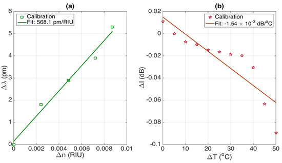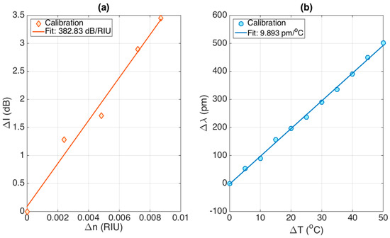 The results of the sensitivity analysis are shown in Figure 7. The left chart shows the RI sensitivity, which shows a trend that has good linearity over the working range. In order to mimic a typical application in biosensors, which is facilitated by the presence of a gold film coating the fiber [6], the calibration has been performed over a short working range (8.7 × 10−3 RIU). The linear fit (R2 = 0.9822) allows estimating the RI sensitivity as ΔI/Δn = 382.83 dB/RIU. The second chart shows the temperature calibration, performed over a 50 °C interval. The data show great linearity, similar to the typical operation of FBGs, with a sensitivity Δλ/ΔT = 9.893 pm/°C (R2 = 0.9982), which is a coefficient similar to the nominal ~10 pm/°C for FBGs inscribed into glass fibers [26].