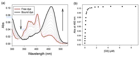 Binding of pyranine to PAMAM G5 dendrimer. (a) Absorbance spectra; (b) absorbance profile at 460 nm. [pyranine] = 6.04 μM.