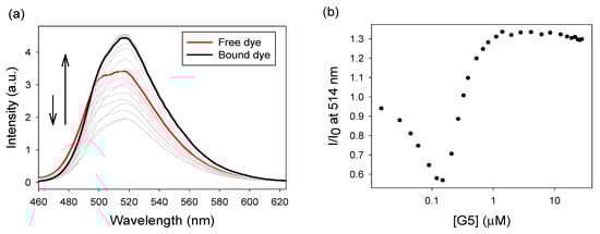 Fluorescence measurements performed in the same conditions (Figure 2a) showed an initial decrease in emission followed by an increase to a plateau (see Figure 2b). When only small amounts of PAMAM G5 are added and the pyranine/G5 ratio is high, a complex is formed with the maximum number of pyranine molecules that can be accommodated per G5 dendrimer. Here, the bound dye molecules are close enough to self-quench by resonance energy transfer (RET). Further additions of dendrimer then decrease the pyranine/G5 ratio, which favors the formation of a 1:1 dye:dendrimer complex, with the dyes well separated; this gradual inactivation of the RET self-quenching results in the observed increase in emission intensity. In this case, the dye was more fluorescent in its bound state than free in solution; increased rigidity in the bound conformation provided fewer opportunities for non-radiative decay.