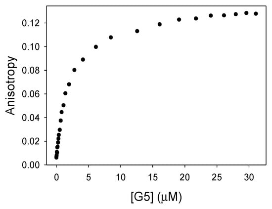 Fluorescence anisotropy profile for the binding of pyranine to PAMAM G5. Excitation: 418 nm; emission: 514 nm. [pyranine] = 6.04 μM.