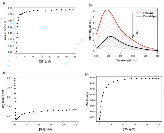Binding of calcein to PAMAM G5 dendrimer. (a) Absorbance profile at 500 nm; (b) fluorescence emission spectra; (c) fluorescence emission profile; and (d) fluorescence anisotropy. Excitation: 496 nm; emission: 518 nm. [calcein] = 6.36 μM.