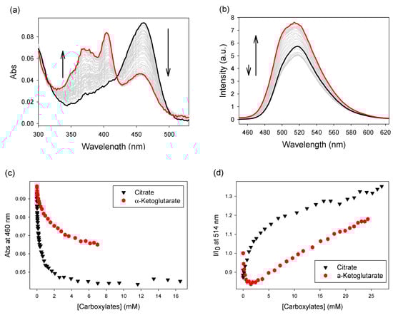 Binding of carboxylates to PAMAM G5 using pyranine as indicator. Titration of citrate into [pyranine•PAMAM] (the black spectrum represents the titration’s starting point; the red one represents the last point): (a) absorbance spectra; (b) fluorescence emission spectra. Titration profiles for binding citrate and α-ketoglutarate to PAMAM G5: (c) absorbance; (d) fluorescence emission. Excitation: 420 nm, emission: 514 nm. [pyranine] = 6.04 μM, [G5] = 0.213 μM.