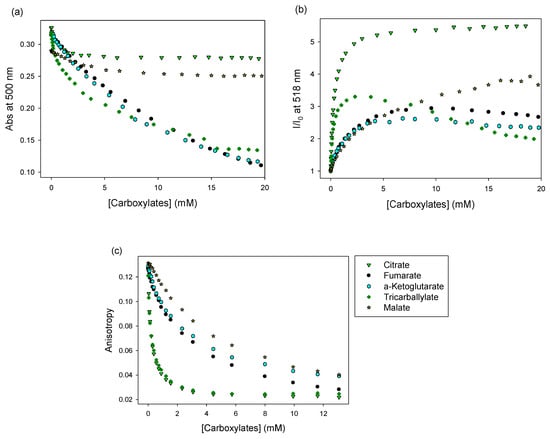 Fluorescence anisotropy was once again the most direct indicator of binding; on addition of carboxylates it smoothly decreased to the low value typical of the free dye, indicating dye displacement and carboxylate binding to PAMAM G5 (Figure 6c). The slope of each anion’s anisotropy titration profile is proportional to its affinity for PAMAM G5; as expected, higher-charged anions (e.g., tricarboxylates) were found to have higher affinity to the polycationic PAMAM G5 [].