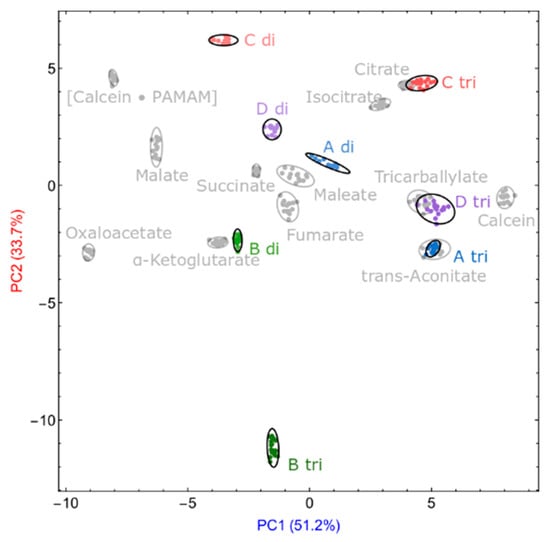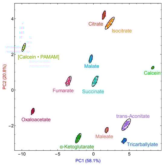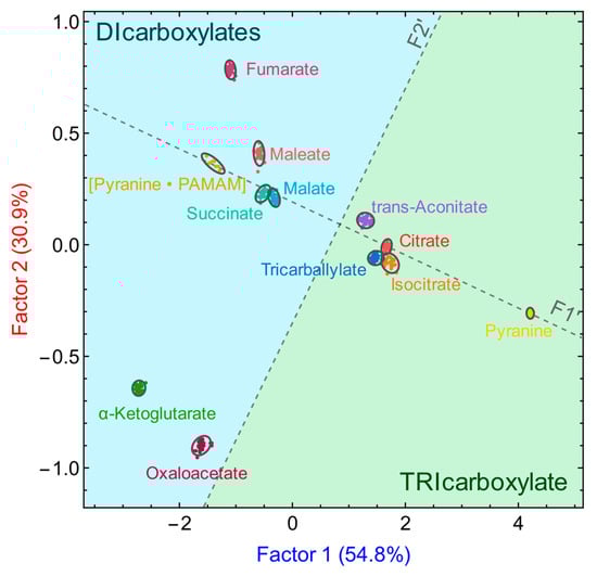 Furthermore, considering a convenience axis F1′ that connects the free dye reference cluster to the bound dye in the scores plot, the projections of all cluster centroids onto this axis can be correlated to the affinity of the respective anions for the PAMAM G5 dendritic host. In fact, in this system the total stoichiometric concentration is the same for all anions, so the extent of dye displacement reflects the extent of the anion’s own binding which, in turn, is controlled by their relative affinity to the PAMAM receptor. Tricarboxylates, which have higher affinity for the G5 polycations [], resulted in a more complete displacement of the dye; therefore, in a tricarboxylate–PAMAM–dye solution, the dye was mostly found in its free state, and these samples appeared spectroscopically similar to the free dye, so their clusters were found closer to the “free dye” reference along the F1′ axis in the scores plot. Similar reasoning explains the fact that samples of the lower-affinity dicarboxylate anions, which contain a larger portion of PAMAM-bound dye, ended up closer to the “bound dye” reference.