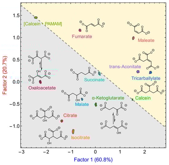 The separation brought about by the [calcein•PAMAM] sensing complex could be connected to the analytes’ chemical features as well. In fact, the resulting LDA scores plot could be divided in two regions, in grey and yellow in Figure 9. On the one hand, analytes containing hydroxyl functional groups were found in the grey region. Note that, in this respect, oxaloacetate and α-ketoglutarate are categorized as hydroxyacids together with citrate, isocitrate, and malate, because in aqueous solution they are predominantly found in their enol form, as shown in Figure 9. Additionally, the enol form of oxaloacetate can form an effective intramolecular hydrogen bond between the OH group of the enol and the distal carboxylate group, in a six-membered ring interaction; on the other hand, the same H-bond in the enol form of α-ketoglutarate is not as stabilizing because it would form a seven-membered ring. The enol form of oxaloacetate is more stable and therefore more abundant than that of α-ketoglutarate, so oxaloacetate has a more pronounced “hydroxycarboxylate character” than α-ketoglutarate. This causes the oxaloacetate cluster to be found deeper into the hydroxyacid region than α-ketoglutarate and further away from the separator line. On the other hand, carboxylates with other chemical features in addition to the COO− group, but no OH groups, were found in the yellow region: examples of such additional chemical features are, for instance, the C=C bond in fumarate, maleate, and trans-aconitate, and the closely spaced and interacting carboxylate groups in maleate, trans-aconitate, and tricarballylate. Finally, “featureless” carboxylate such as succinate (1,4-butanedicarboxylate) did not belong to either of these two groupings; instead, their clusters were found close to the “free dye–bound dye” construction line. The importance of the hydroxy feature in driving further differentiation among carboxylates with otherwise similar charge and structure agrees with previous results from our group [], which indicated that the amine-terminated PAMAM polyelectrolytes act as hydrogen bond acceptors, so they are sensitive to the presence of hydrogen bond donor groups such as OH in their binding partners.