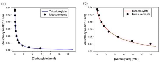 Fluorescence anisotropy standard curves for concentration determination for (a) tricarboxylates and (b) dicarboxylates. [calcein] = 6.36 μM, [G5] = 2.13 μM.