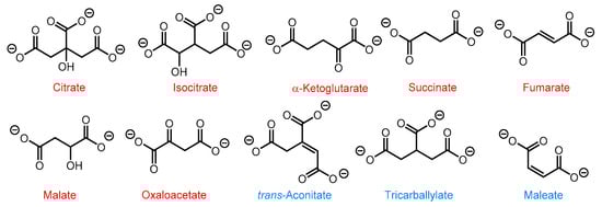Structures of the carboxylates of interest (red: citric acid cycle intermediates, blue: other, structurally similar carboxylates), shown in their protonation state in water at pH 7.4; see Table S1 for relevant pKa values.
