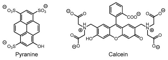 Structures of calcein and pyranine in their protonation state in water buffered to pH 7.4; see Table S1 for pKa values.