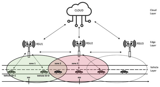 In this work, the considered scenario is a multi-layered architecture composed of three different parts: the vehicle layer, where there are vehicles traveling on the road; the edge layer, where there are RSU devices able to cover a specific portion of the map; and the cloud layer, where there is a centralized server able to perform different complex tasks (Figure 1). The roadside RSUs communicate with each others through the backbone infrastructure. Each RSU is equipped with an on-board processor for elaborating data, and for making decisions on the vehicles management. By taking advantage of 5G networks, latency is reduced to a few milliseconds [39]. A brief characteristics comparison between MEC and Cloud computing is shown in Table 1 [23].