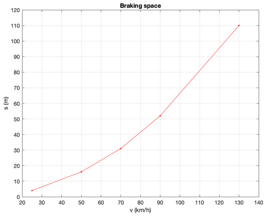 The braking distance depends on the condition of the vehicle and the road surface, which determine the value of the deceleration . However, the important thing is that the braking distance increases with the square of the speed. For a car in good condition, on a road with medium grip, the braking distances are very similar to the values indicated in Table 4 and shown in Figure 3.
