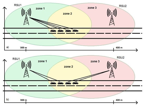 In this work, without loss of generality, it is assumed that all vehicles travel in one direction. To facilitate the simulation and make it faster, the two servers are supposed to be at a distance of 100 m from each other and their coverage range is 90 m. In this way, it is possible to know what happens during switching mechanism since the vehicles remain in the area covered by both nodes for a sufficiently long time (see Figure 1). Figure 1 shows three different zones: Zone 1 is covered by first RSU; Zone 2 is where a mobile device can be covered by both RSUs, here the switching mechanism takes place; and Zone 3 is covered by only second RSU.
