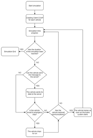The latency time concerns the communication time with cloud or edge server. The vehicle is able to decide if it should communicate with one of the two servers on the basis of the traffic condition in order to guarantee avoiding collisions. It is expressed in milliseconds (ms) and depends on the distance between vehicle and server location. The cloud server is remotely placed, while the MEC server is located in the road side unit (RSU) on the road side and, thus, near the vehicle and able to guarantee a lower latency in the communication. In our study, the latency time was set to 1 ms, considering as communication technology 5G [42,43]. In particular, this value was set equal for the communication with both server typologies.
