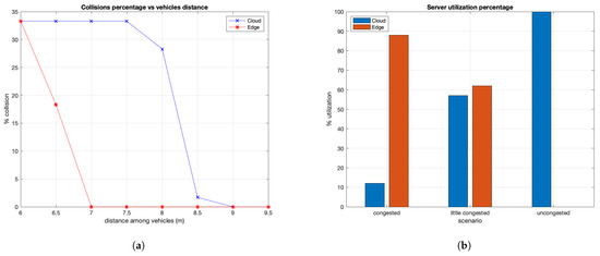 (a) Collision percentage vs. vehicles distance; (b) server utilization vs. traffic congestion.