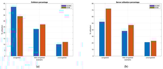 Thus, Figure 11 shows how the edge with cell breathing-like mechanism and warning propagation, the SCARE approach, can perform in comparison with the approach of the edge with warning propagation but without RSU load balancing, the EDGE one. It is possible to see that, in the case of congestion, the SCARE approach can improve the performance of the server load, but it can increase the collisions percentage because some extra message delay due to the additional involved RSU. So, the warning condition is not respected producing collisions among vehicles. However, when the road congestion is medium-low, “little congested scenario” in the figure, the SCARE approach improves its performance for both collision and server usage percentage, guaranteeing lower values for both output parameters. In the last case, where no congested roads are considered, both approaches perform in a similar way because the RSU load balancing is not activated and the warning can be propagated in the single RSU respecting the threshold time for the car collision.