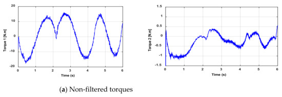 The measurements are performed on the test bench in order to collect both the joint position and torque data. However, these data may be noisy and biased due to bad sensors, such as the quantization noise of the encoder. Then, to improve the accuracy of the parameter identification, a low-pass filter, e.g., the Butterworth filter, is used to treat data (inputs/outputs) online. This filter’s cutoff frequency is set to , where represents the estimated natural frequency of the robot. The filtered torques are shown in Figure 3. All filters are implemented in their discreet form with the same sampling period of the control loop.