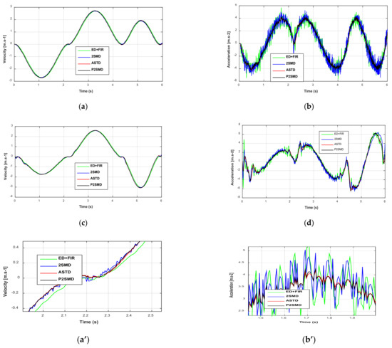 Estimated velocities and accelerations: (a) Time evolution velocities for joint 1; (b) Time evolution accelerations for joint 1; (c) Time evolution velocities for joint 2; (d) Time evolution accelerations for joint 2. Zoom of estimated velocities and accelerations: (a’) Time evolution velocities for joint 1; (b’) Time evolution accelerations for joint 1; (c’) Time evolution velocities for joint 2; (d’) Time evolution accelerations for joint 2.