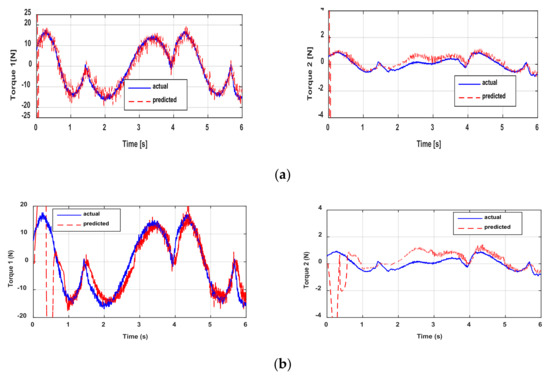 where Nn is the number of samples and are the ith actual and estimated parameters, respectively. Good validation requires a good prediction of the torques of each joint. To quantify the quality of torque prediction, some criteria are calculated, such as the RMS error (RMSE) already defined in Equation (35), and the coefficient of determination, denoted by R2, is also computed to assess the strength of the linear relationship between the actual torques and the predicted ones. The formula used to calculate this coefficient is as follows: