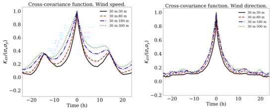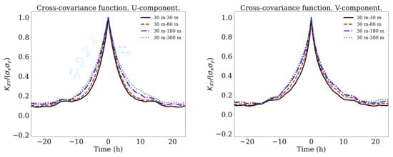in which x and y represents the measurements obtained at two different height, t is the time and the time lag. and denote respectively the expected value and the transpose of a given random vector. The results are shown in Figure 3 for and . The most interesting aspect of these graphs was the two peaks in the wind speed correlation at h which seemed to suggest a dependence between diurnal and night values. These peaks were less marked in the u,v-cases as is shown in Figure 4.