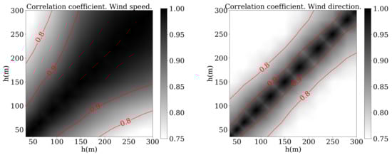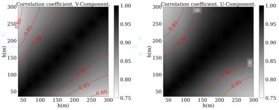 where and are the variable values at two different altitudes and , are the average values for a period of time. Figure 5 shows the results for and while Figure 6 shows the results for u and v. In those figures black color denotes a very high correlation between the heights indicated in horizontal and vertical axes. The correlation is 1 for the diagonal, as it indicates the relationship between a certain height and itself. Measurements presented a higher correlation with those taken at a closer location and decays when compared to values measured higher or lower in the profile. That explains the white colour close to the corners. What is striking about these figures is that, in the case of the wind direction, the correlation decayed faster than in the other three cases.