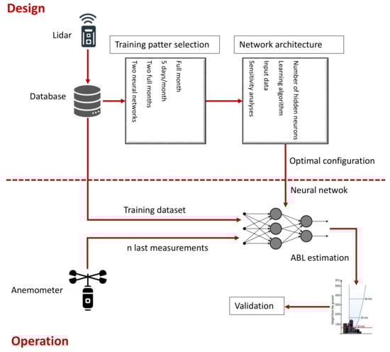 However, none of the approaches presented until now is totally satisfactory, as most of the times the vertical profile has not been studied or, when it is considered, its temporal evolution is not addressed [20,21]. This paper presents a novel methodology for the prognosis of complete ABL wind profiles that only requires a limited set of surface observations. The proposed approach comprises the use of a neural network that will be trained with 60 days of lidar wind profile measurements (wind speed and direction). Lidar sensors offer unique advantages for wind profiling [22] and are the preferred solution for high-end applications. Nevertheless, they are really expensive instruments that make them unaffordable for most applications. This is especially true when considering that wind profiles are highly site-dependent thus, the characterization of the ABL over a certain area (e.g., for the construction of a wind farm) would require the installation of multiple lidar stations at several different locations.
