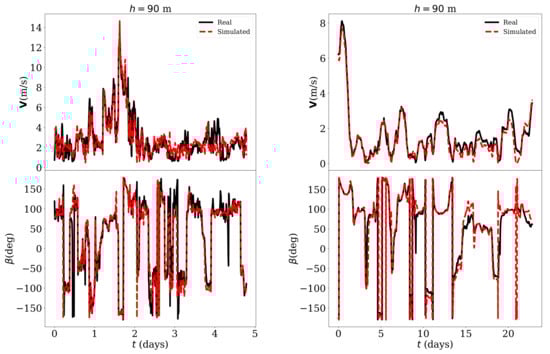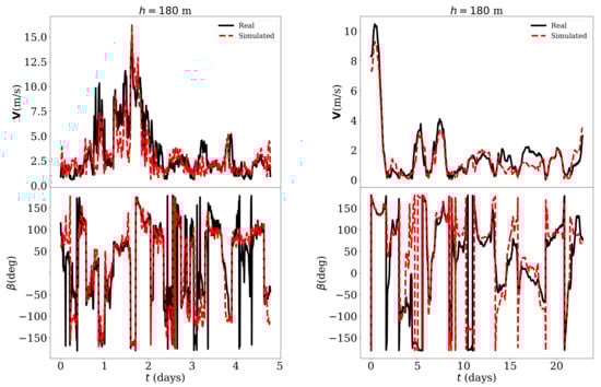 The good agreement between the simulation results and the measurements envisaged thanks to the high value of the Pearson coefficient could also be verified directly by observing the simulated and real temporal series. For example, Figure 9 shows—for m—the 10-min temporal series of and —values reconstructed with the estimated variables u and v using Equation (7) and (8)—for 5 days in February, 2019 which were not part of the training data. In the same figure, the hourly-averaged temporal series of the same variable for the whole month was also compared. The results for m are shown in Figure 10 in which a lower estimation error could be noted.