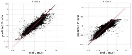Although previous work in the literature has made use of a () definition of the wind vector, the approach suggested in this work of using vector components (u, v) demonstrated a better performance in terms of estimating u, v and . The opposite was true for the wind speed. Even though it would depend on each case, we considered that, for most of the applications, the improvements achieved by (u, v) were worthwhile. For example, the decreased from m/s to 1.65–1.67 m/s which was a reduction of 40%. A relevant improvement could be also found in v (16%) and (34%). On the other hand, the value of increased by 4%.