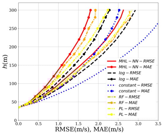 Once the neural network was fully defined and trained, it has been able to show it capabilities to estimate ABL wind profiles for altitudes up to 300 m above the ground. When compared with more traditional (but simpler) methods like the logarithm and power laws, it has exhibited a better performance at every height. For example, the mean absolute error () is reduced between 17% and 24%, depending on the considered height. Furthermore, the proposed neural network is able to also outperform other complex techniques used for wind estimation, such as the random forest method. However, differences are notably smaller in that case ( is reduced by about 5%).