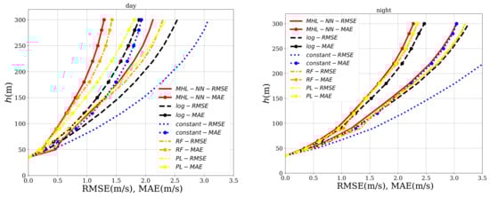 To study their effects, two new nodes can be added to the input layer of the neural network, one for the hour and one for the day of the measurements. In addition, the data were split into two sets according to whether the measurements were taken during the day (8:00 AM–20:00 PM) or at night (20:00 PM–8:00 AM). Therefore, for each altitude, two neural networks were created: one trained using the hours between 8:00 AM–20:00 PM and one using the interval 20:00 PM–8:00 AM. The results can be seen in Figure 13, in which all the methods are readjusted using the same time intervals. The most obvious finding to emerge from the analysis is that the error was much smaller at day, when the ANN clearly outperformed the other methods. The wind speed and were further reduced between a 20% and 25% for m when compared with the error values obtained in Section 4.2. At night, all methods decreased in their performance. Just behind the ANN, the random forest achieved the second-best mark. The results suggested that temperature and radiation played an important role in the wind dynamics of the region for m.