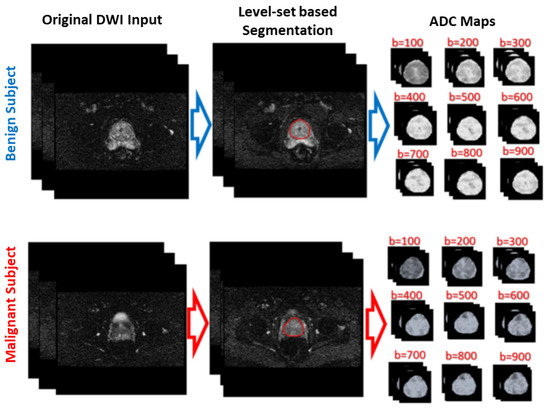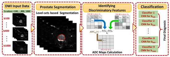 The main contribution of this work does not depend on which deep learning network is used; the main contribution is representing the input data in a different form (ADC maps) to be more separable to achieve acceptable accuracy, no matter which deep learning network is used. To prove this point, AlexNet, which is a deep learning network that has only five convolutional layers, is used in the beginning. AlexNet achieved an average accuracy of at the nine b-values. For further validation, VGGNet, which has more layers that increase its learning ability, is then used. VGGNet achieved an average accuracy of at the nine b-values. The ADC maps used in the proposed system are calculated at both low and high b-values. This enables the proposed system to capture both blood perfusion and water diffusion for an accurate diagnosis of prostate cancer. The b-value is a measure of the degree of diffusion weighting employed to generate diffusion-weighted images. It is a parameter that relies on the timing and strength of the used gradient pulses. The details of this process are discussed in the following sections.