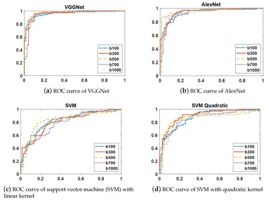 ROC curves at five b-values(100, 300, 500, 700, and 1000 s/mm2) of four different classifiers: (a) VGGNet, (b) AlexNet, (c) SVM with linear kernel, and (d) SVM with quadratic kernel. As these figures show, CNN-based models (VGGNet and AlexNet) result in higher AUCs than the two variants of SVMs with linear and quadratic kernels at the distinct b-values.