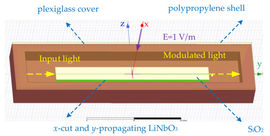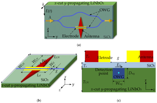 Figure 2 shows the diagram of the sensor simulation model established by ANSYS HFSS. A x-cut and y-propagating LN crystal with length LLN = 50 mm, width WLN = 6 mm, and thickness TLN = 0.5 mm was established as the substrate of the sensor. A LN OWG with width Wwg = 6 μm and depth Dwg = 4 μm was embedded in the LN crystal. In order to reduce the influence of the light absorption of the metal electrode on the sensor, a SiO2 buffer layer with a thickness of 4000 Å was added above the LN substrate. Above the SiO2 layer, there was a tapered antenna with arm length La = 2.5 mm, bottom width Wa = 1 mm, and thickness Ta = 1 μm. The bottom of the tapered antenna was connected with the parallel modulation electrode with length Lel = 5 mm and width Wel = 20 μm. The width of the narrow gap was 10 μm in a parallel modulation electrode. The sensor was packaged by the polypropylene and plexiglass with relative permittivity of 2.15 and 3.4.