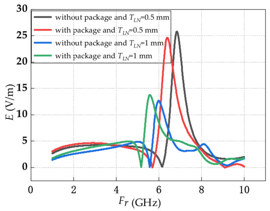 Figure 3 shows the resonant frequency of the sensor with the same tapered antenna but different LN substrate and package. For TLN = 0.5 mm and without package, the resonant frequency of the sensor was 6.84 GHz. For TLN = 0.5 mm and with package, the resonant frequency of the sensor was 6.39 GHz. For TLN = 1 mm and without package, the resonant frequency of the sensor was 5.99 GHz. For TLN = 1 mm and with package, the resonant frequency of the sensor was 5.58 GHz. From Figure 3, the largest resonant frequency was induced for the TLN = 0.5 mm and without package. For the sensor with package, the resonant frequencies were both reduced under TLN = 0.5 mm and TLN = 1 mm. When TLN was increased from 0.5 mm to 1 mm, the resonant frequencies of the sensor both packaged and without package were reduced.