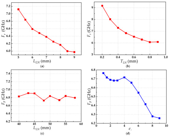 The relationships between the resonance frequency Fr and the LN substrate and the relative permittivity of the packaging material: (a) Fr versus WLN; (b) Fr versus TLN; (c) Fr versus LLN; (d) Fr versus εr.