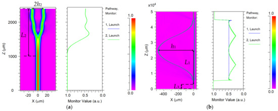 Meanwhile, in order to reduce the transmission loss of the OWG MZI and improve the efficiency of the sensor, MZI was designed by Rsoft. As shown in Figure 5, The MZI was composed of an input straight waveguide, Y-branch waveguide, and cosine curved waveguide. The input straight waveguide with a length of 5 mm was designed to improve the stability of light transmission from the fiber to the OWG. To reduce the transmission loss, the ratio between the bend length L2 and the bend height h2 of the Y-branch waveguide needed to satisfy L22/h2 > 250 [37,38]. Here, the bend height and length were designed as h2 = 12.5 μm, L2 = 1400 μm. It was considered that the total length of the MZI was 50 mm, the length L1 of the cosine bend waveguide was 18.6 mm. The relationship between the height and length of the cosine bending waveguide can be described as Equation (9). The length difference between the two arms of the MZI was designed as ΔL = 32 μm to ensure finding the best working point of the sensor [39]. From Equation (9), when ΔL = 32 μm, the height h1 of the cosine curved waveguide can be calculated as 464 μm.