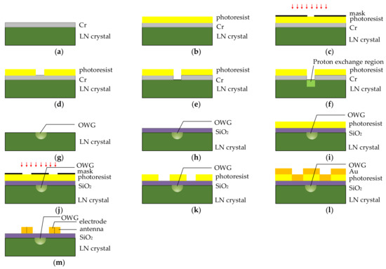 Fabricate process: (a) Cr-plated barrier; (b) coat with photoresist; (c) align and expose; (d) develop; (e) etch; (f) proton exchange; (g) finished OWG; (h) Sputter SiO2 buffer layer; (i) coat with photoresist again; (j) align and expose again; (k) develop again; (l) plate antenna and electrode; (m) ultrasonic stripping.
