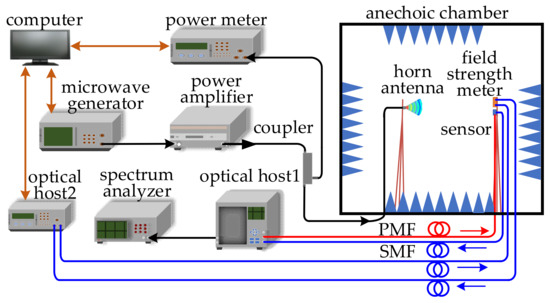 Figure 8 shows the schematic of the sensor frequency response measurement experimental setup. The microwave generator (ROHDE & SCHWARZ®SMA100B) with a frequency range of 8 kHz to 40 GHz was used as the microwave source. By using two power amplifiers (RFLIGHT 10 kHz~6 GHz and RFLIGHT 6 GHz~18 GHz), the microwave signal was amplified and transmitted to the coupler. The microwave signals output from the coupler were transmitted to the horn antenna with bandwidth from 800 MHz to 18 GHz and the power meter by a constant proportion. The sensor received the microwave signal emitted by the horn antenna. A standard EO field strength meter was placed close to the sensor to monitor the electric field strength of the radiated microwave signal. The optical host1 consisted of a PD (KG-PD-20 G), a micro integrable tunable laser assembly (ITLA), a bias micro-control circuit (MCU), and an optical coupler (OC). The linear polarized light from the optical host1 was transmitted to the sensor through the polarization-maintaining fiber (PMF). Then the linear polarized light traveling through the OWG was modulated by the microwave signal. The output modulated optical signal was transmitted to the PD through the single mode fiber (SMF) and converted into electrical signal. The detected electric field signal was extracted by the spectrum analyzer (ROHDE & SCHWARZ®FSW43) with a frequency range of 2 kHz to 43.5 GHz.